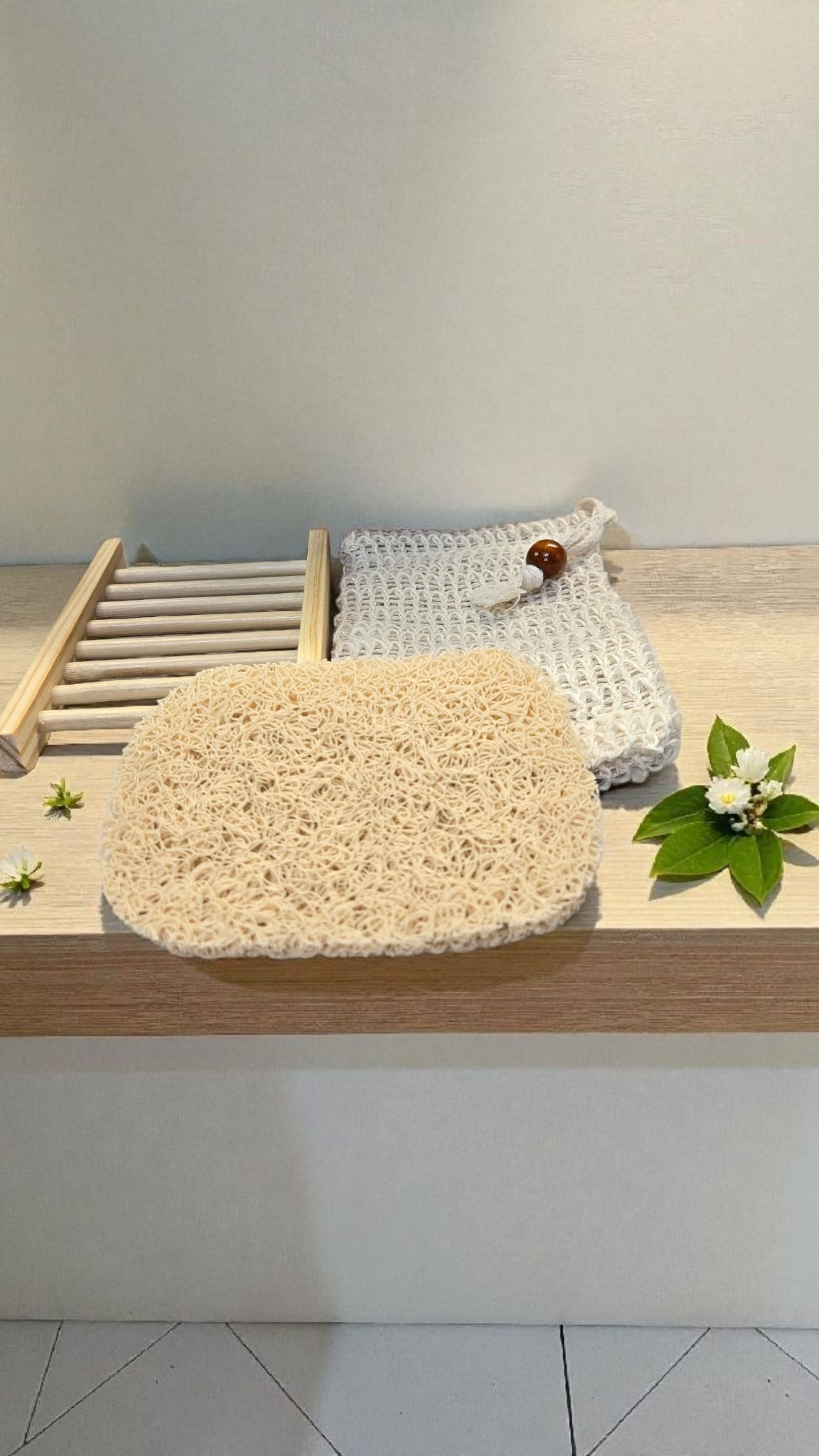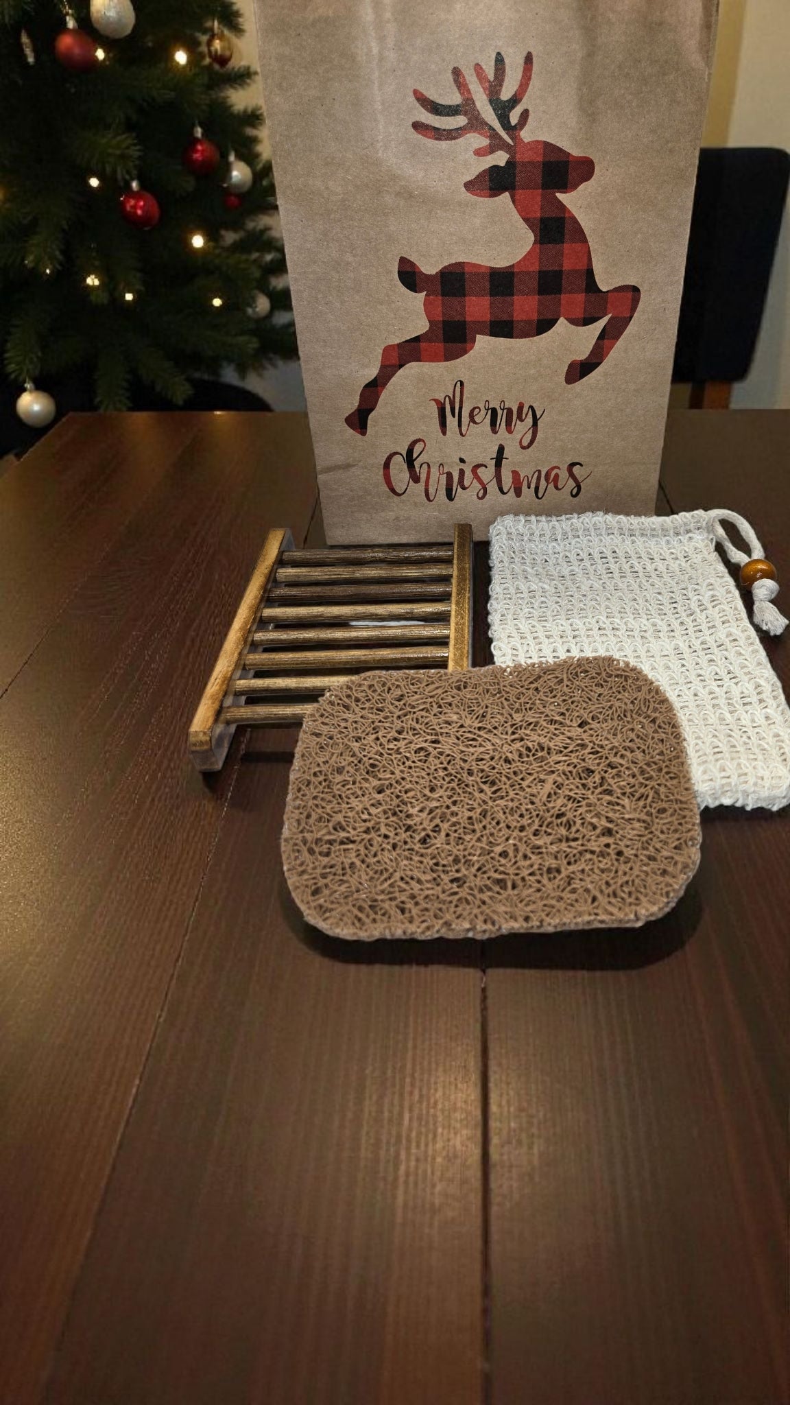 Elevate your goat milk soap experience with our Soap Saver Bundle — designed to extend the life of every bar. Each set includes a handcrafted wooden soap holder, a durable PVC soap pad, and a cotton-linen soap saver bag for gentle exfoliation and mess-free use.